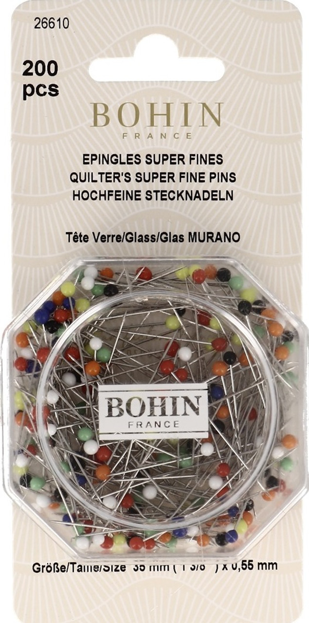 Super fine glass headed pins, ideal for delicate and quilting fabrics. Does not melt when ironing.