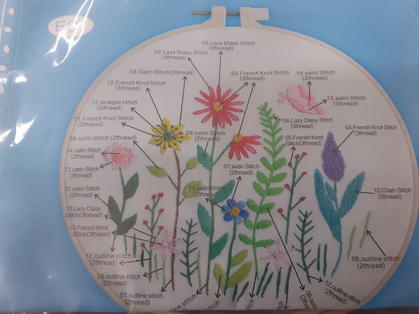 Kit includes Bamboo hoop, fabric, embroidery thread, needle, scissors and instructions.