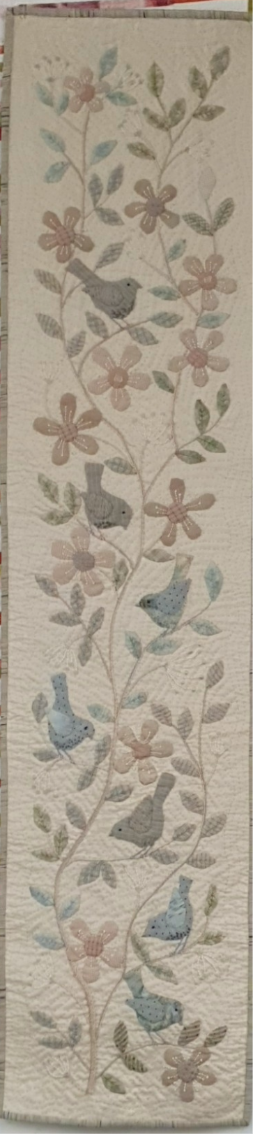 Hand Applique, Hand Embroidery and Hand Quilting is used to create this soft and gentle wall hanging table or bed runner.