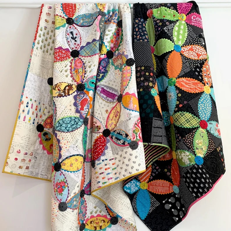 This is a wonderful quilt for all the ric-rac fans out there. The machine sewn orange peel blocks are edged with ric-rac and finished with colour popping YoYo puffs.